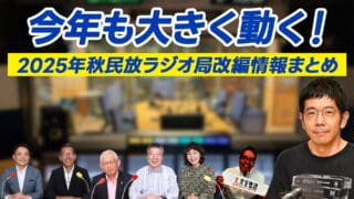 番組改編【随時更新中】ラジオ 2025年秋改編タイムライン 2025年も10月の秋改編が近づいてまいりました。ここではラジオ各局の秋改編の情報をまとめてお届けします。文化放送はライターの武田砂鉄をメインに据えたワイド帯番組、ニッポン放送は峯村健司と松本秀夫アナのコンビによるワイド番組がスタート。 2025.08.27番組改編