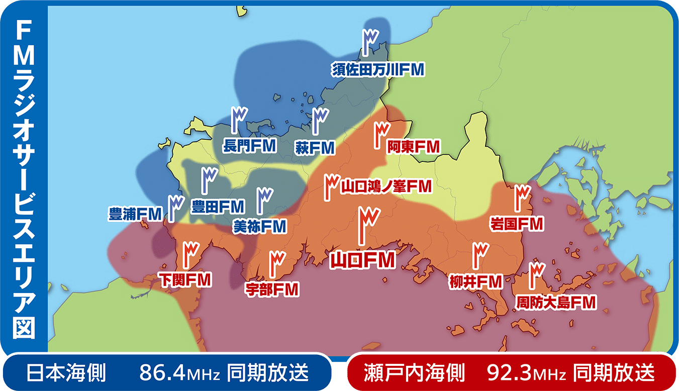 第1次実証実験を実施している13局中、唯一AM親局である周南局も停止させている山口放送はすでに14のFM中継局を運用しており、山口県のほぼ全域でFM放送を聴取可能となっています。FM化についていち早く取り組んでおり、瀬戸内海側は92.3MHz、日本海側は86.4MHzでの「FM同期放送」を実施。同じ周波数が重なる干渉エリアでの雑音問題やそのために中継局の距離をとる必要が出ることで生じる電波の届かないエリアといった課題をクリアに、音声もクリアにしています。第2次実証実験期間の期限である2026年9月30日まで延長されています。