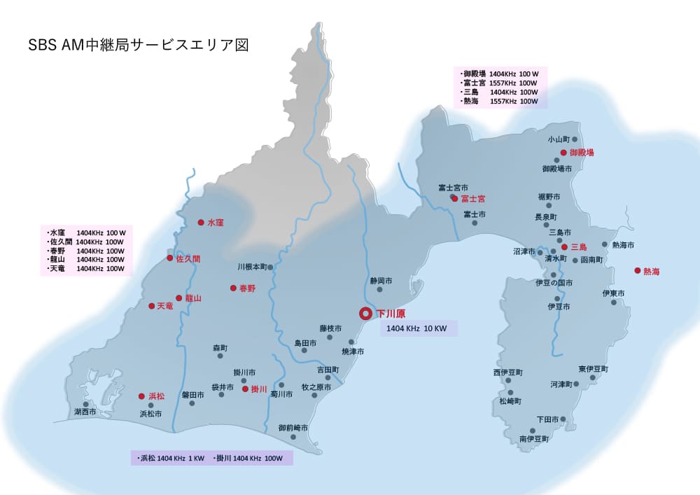 新たに第2期から実証実験を実施するSBSラジオこと静岡放送は三島局、御殿場局、富士宮局の3中継局を運用停止します。それぞれ三島FM局:90.1MHz、御殿場FM局92.1MHz、富士富士宮FM局:94.7MHzのワイドFM局で補完されています。