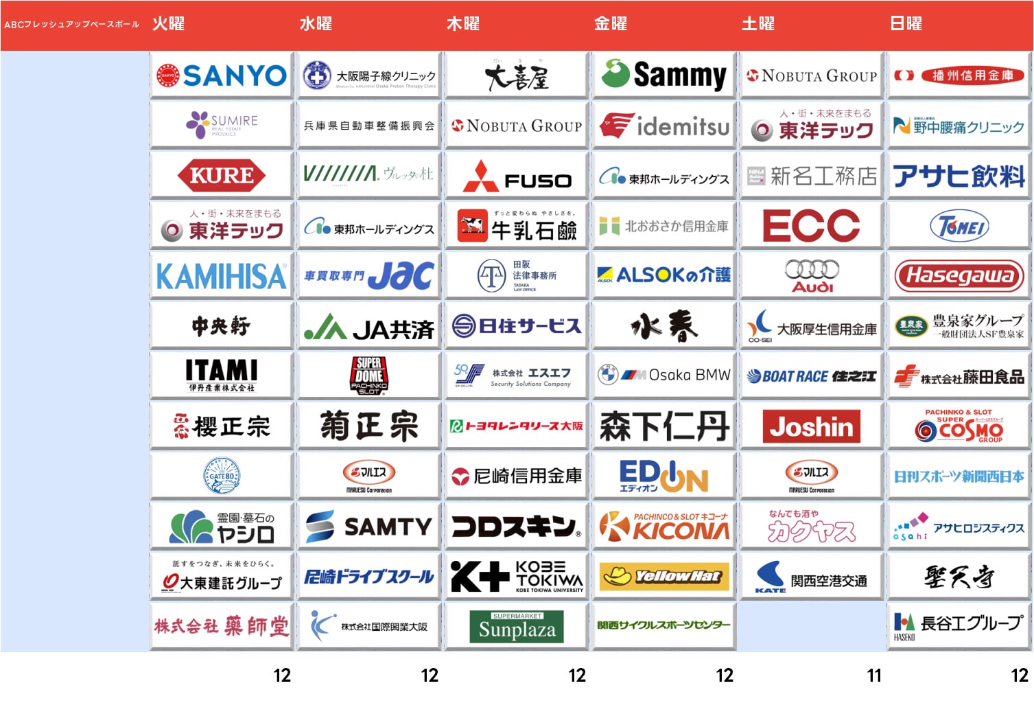 ABCの看板番組『フレッシュアップベースボール』は今シーズンもスポンサー付きが好調。全曜日でスポンサー完売してますね(土曜日は去年同様延田グループが2枠分スポンサーに入っているため実質12社体制)。新規では素泊まり宿として話題のGATE80、STVやCBCに続きABCにも入ったSAMTY、カギと防犯のエスエフ、トヨタレンタリース大阪、ALSOK綜合警備保障グループの介護会社・ALSOKジョイライフ、BMW正規ディーラーの大阪BMW・MINI城東鶴見、金曜はほかに関西サイクルスポーツセンター、日曜はアサヒ飲料やアサヒロジスティクスといった全国エリアの企業も入りました。