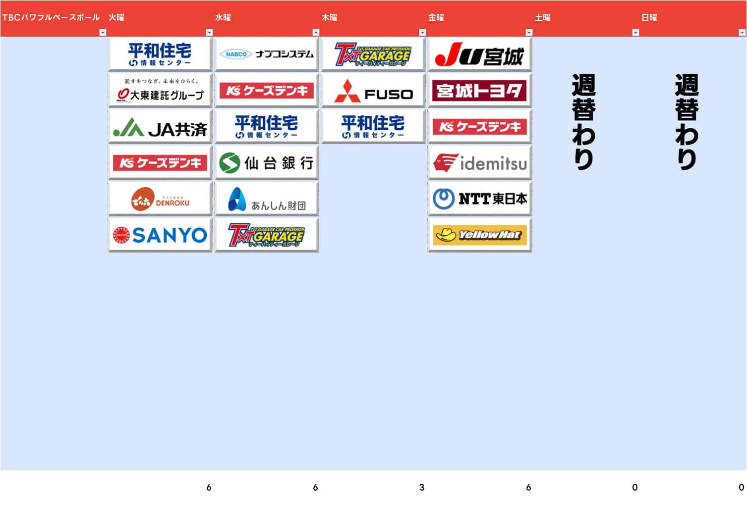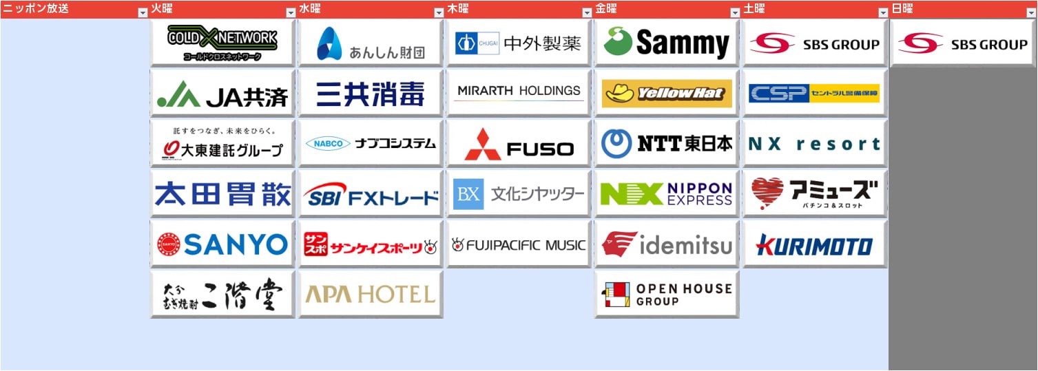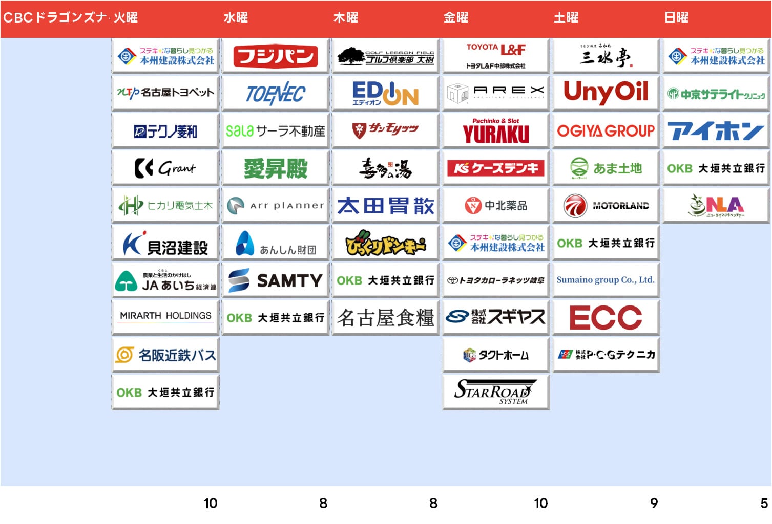 火曜は12社完売、岐阜の朝日土質設計コンサルタントが新規で入り東海クリエイトが火曜枠にもスポンサーに入っています。ちなみにCMキャラクターはこちらも高橋宏斗投手。CM出過ぎで成績悪いんだろうか…。