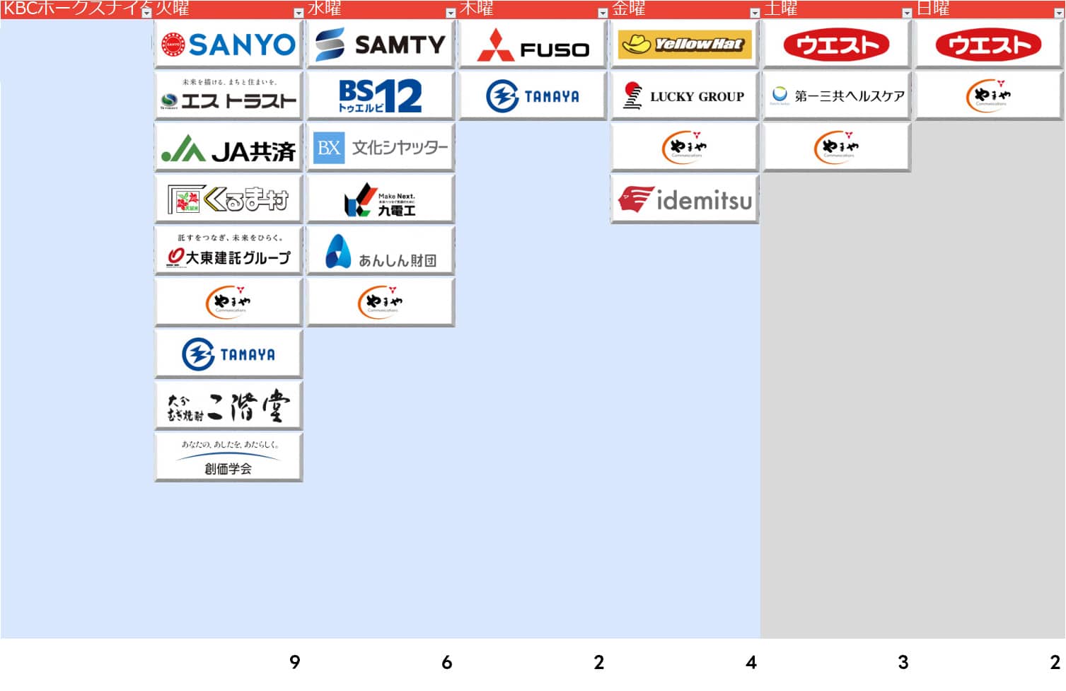 KBCラジオ『KBCホークスナイター』は開幕3連戦は11社から12社とほぼ完ぺきに埋まっていたものの、そこに精力を注ぎ過ぎたのか、レギュラーシーズンは昨年から若干2社増えた程度。火曜が8社→9社、水曜が2社→6社と増えた一方、金曜が7社→4社と減らしています。新規では西部ガスグループの不動産業・エストラスト、RKBから移動してきたBS12、そしてここでもSAMTYがスポンサーについています。意外にニッポン放送では入ってないんですよね…