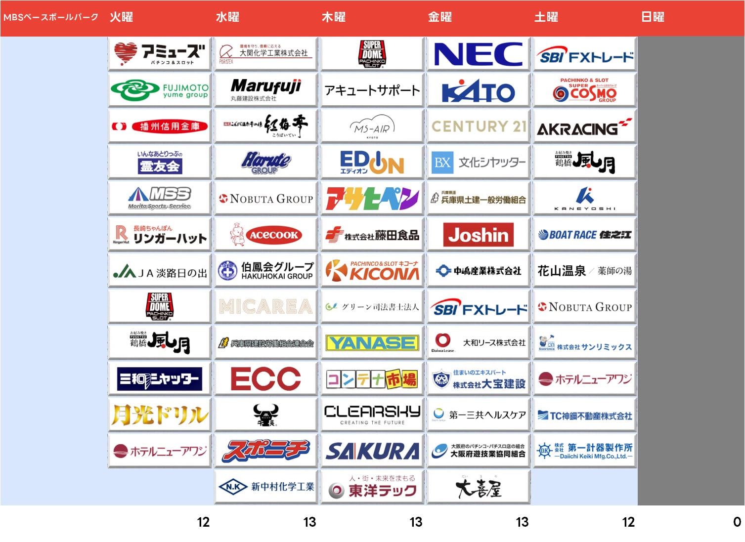 - スーパーコスモグループ、伊丹産業、関西空港交通、田坂法律事務所、野中腰痛クリニック、日刊スポーツ新聞西日本、パチンコ&スロット キコーナ、兵庫県自動車整備振興会、ECC、延田グループ、朝日新聞社、Audi 西宮・神戸・宝塚(PT)
