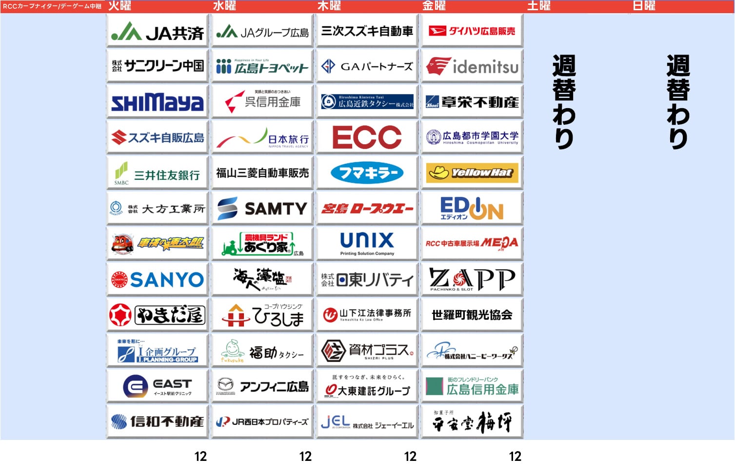 『RCCカープナイター』は2025年度も火曜から金曜はスポンサー12社完売となっています。この地域では三菱ふそうが今期は入っていませんがその分ローカル企業が新規で入るなどしています。呉信用金庫や総合印刷業のユニックス、ごぜん様さま月曜コンビがCMキャラクターの農機具の買取・販売店あぐり家、全国の企業だとフマキラーに三井住友銀行が新規になっていますね。なお土日は今年もカープの試合に応じての編成になるため固定でのスポンサーはつけておらず、試合によっては冠スポンサー付きの中継になる模様です。