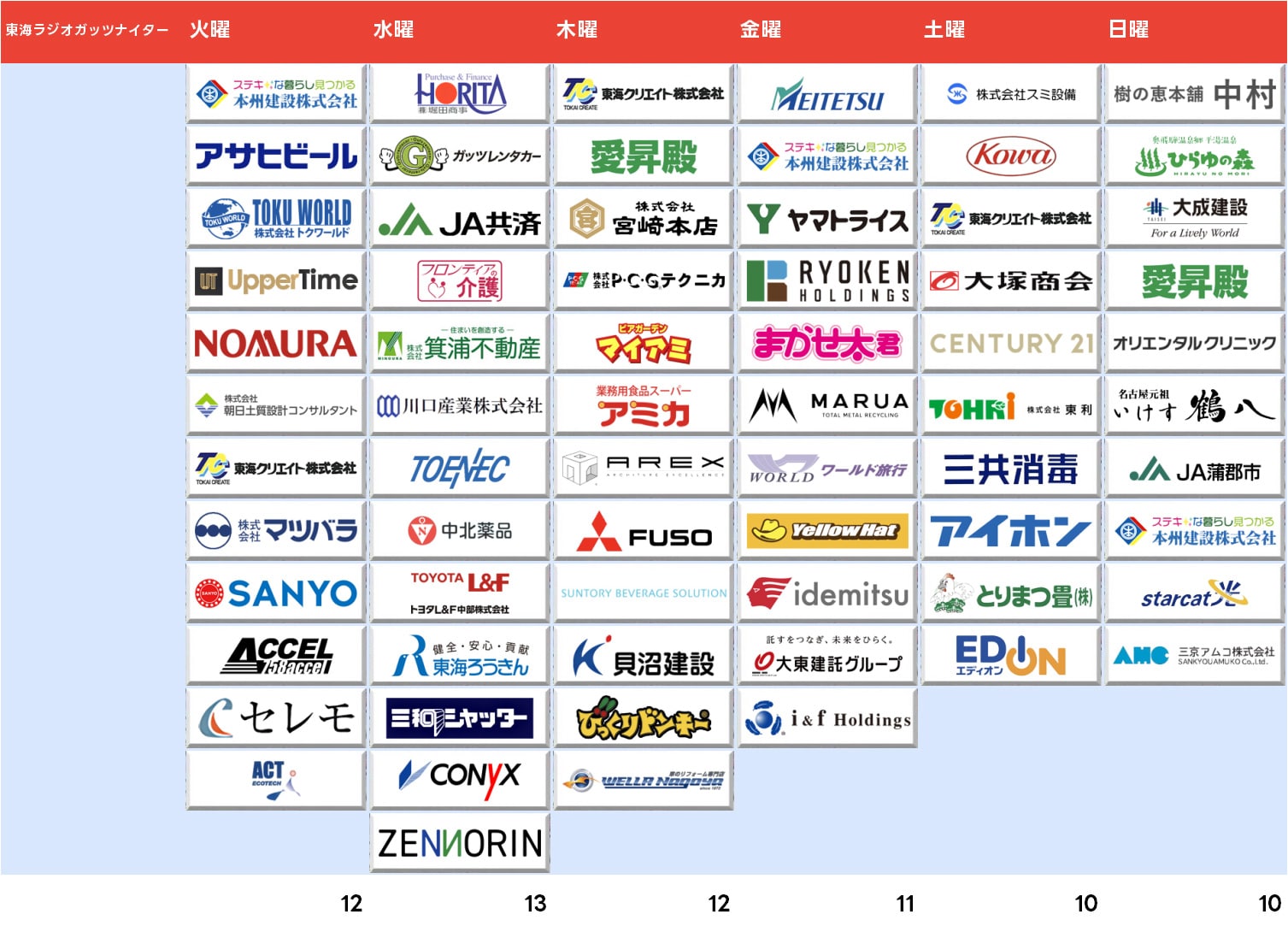 水曜も13社完売、ちなみに通常100秒 (20秒CM×5本以上)提供のところ、新規で入った箕浦不動産は60秒、川口産業40秒のCM数で枠を埋めており、水曜もCM秒数でいうと実質12社体制ですね。CMキャラクターは共にドラゴンズピッチングコーチの山井大介氏。
