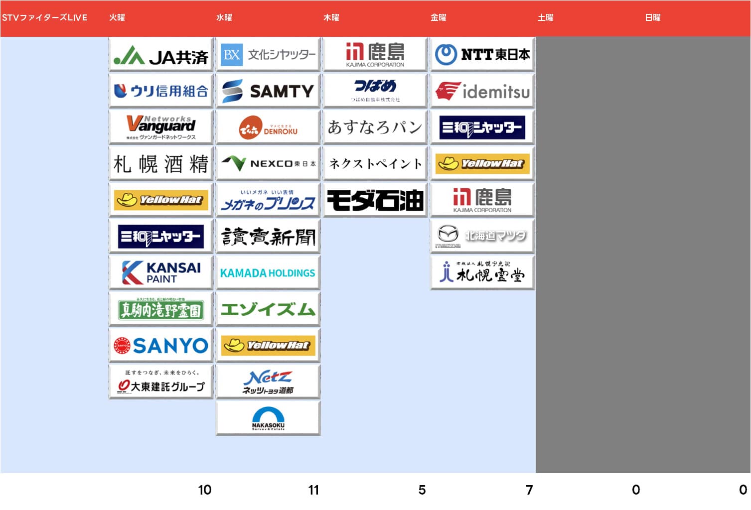 『STVファイターズLIVE』は1日当たりの平均は8.25社ですが2024年4月期の平均9社から若干減らしましたね。水曜日が昨年の7社から11社に増えたものの他の曜日が火曜が11社→10社、木曜は8社→5社、金曜は10社→7社とダウン。昨シーズン通しでついていたメガネサロンルック、朝日新聞デジタル、ウインドヒル、全国犬猫飼い主を探す会に代わってニッポン放送の中継にもついている文化シャッター、RCCの中継でおなじみだったSAMTY、中古住宅+リノベ専門店のNAKASOKUこと中島測量設計、屋内型納骨堂の札幌霊堂が新規参入。ほかには一部スポンサーの曜日入れ替えや複数曜日提供だったスポンサーが1曜日のみになったものもありました。