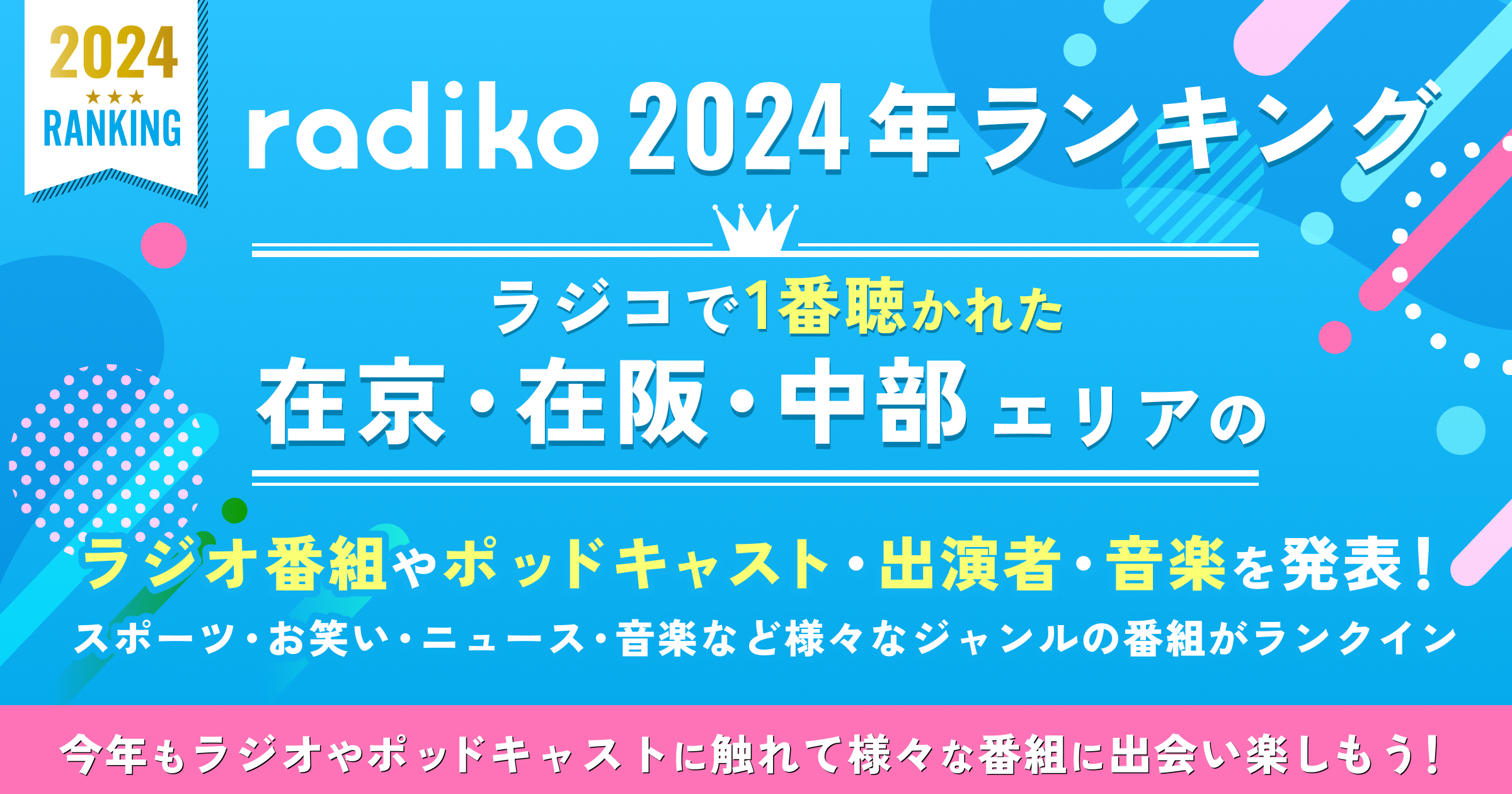 去年に続いて「在京エリア」「在阪エリア」「中部エリア」に分けての発表。集計は2024年1月1日-12月31日の期間に、radikoで聴かれた各番組全放送回の聴取者数(ライブ・タイムフリー・タイムフリー30・エリアフリー合算)をランキング化。つまり帯番組(月~金、もしくは木曜まで放送される番組)の方が放送回数が多くなるため有利にはなっているのですが、さてどうなったでしょうか?